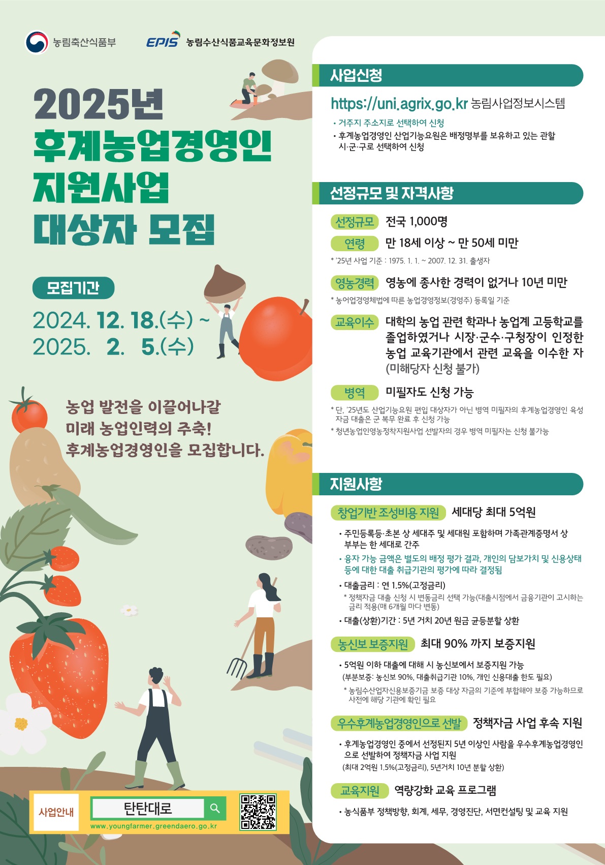 농업발전을 이끌어나갈 후계농업인력을 육성하기 위해 추진하고 있는 2025년 후계농업경영인 육성사업 지원 계획을 아래와 같이 알려드립니다.