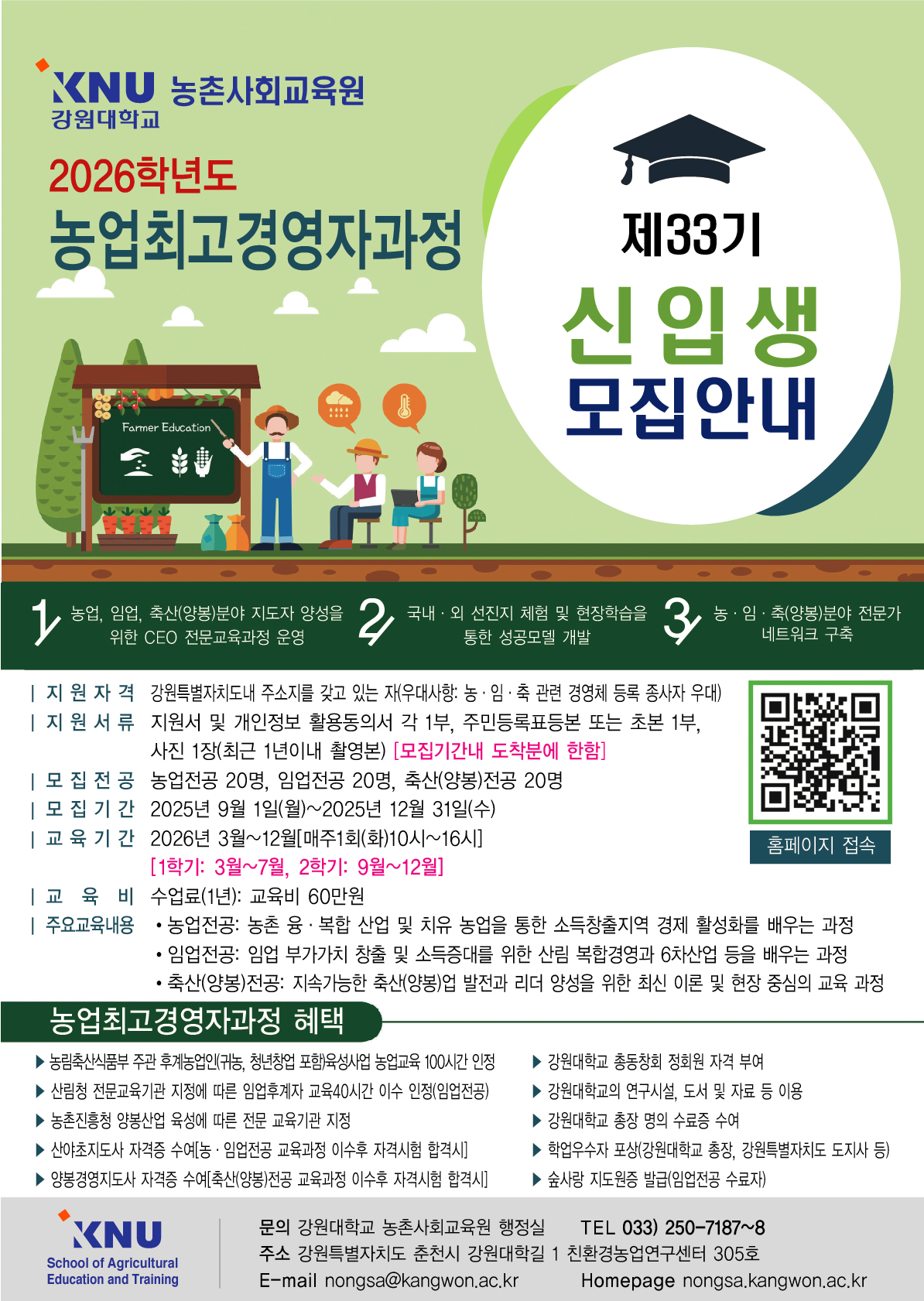 강원대학교 농촌사회교육원에서는 강원 농·임·축 중추적인 역할을 담당할 전문 농업경영인 육성으로 농가소득 향상과 농·임·축 경영 안정화 도모를 위하여 강원특별자치도와 함께 1994년부터 농업최고경영자과정을 운영하고 있습니다.