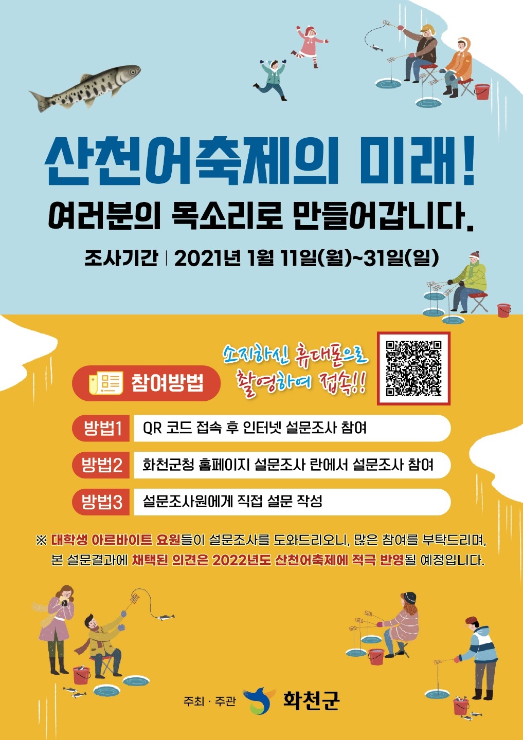 화천군에서는 지난 1.11.부터 산천어축제 방문객을 대상으로 축제의 문제점과 향후 발전방안 에 대한 설문조사를 진행중에 있습니다.