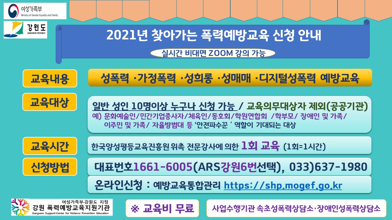 여성가족부 지정 " 2021년 찾아가는 폭력예방교육" 사업 수행기관인 강원폭력예방교육지원기관에서는