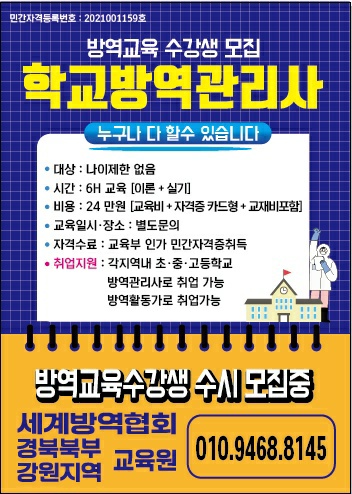 A. 학교 방역관리사 자격증은 이론과 실습을 거친후 현장으로 인력이 투입되기에 철저한 관리하에 자격취득이 이루어집니다.