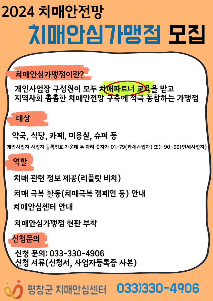 평창군 치매안심센터에서는 지역사회의 촘촘한 치매안전망 구축을 위하여 치매안심가맹점을 모집하고 있습니다!