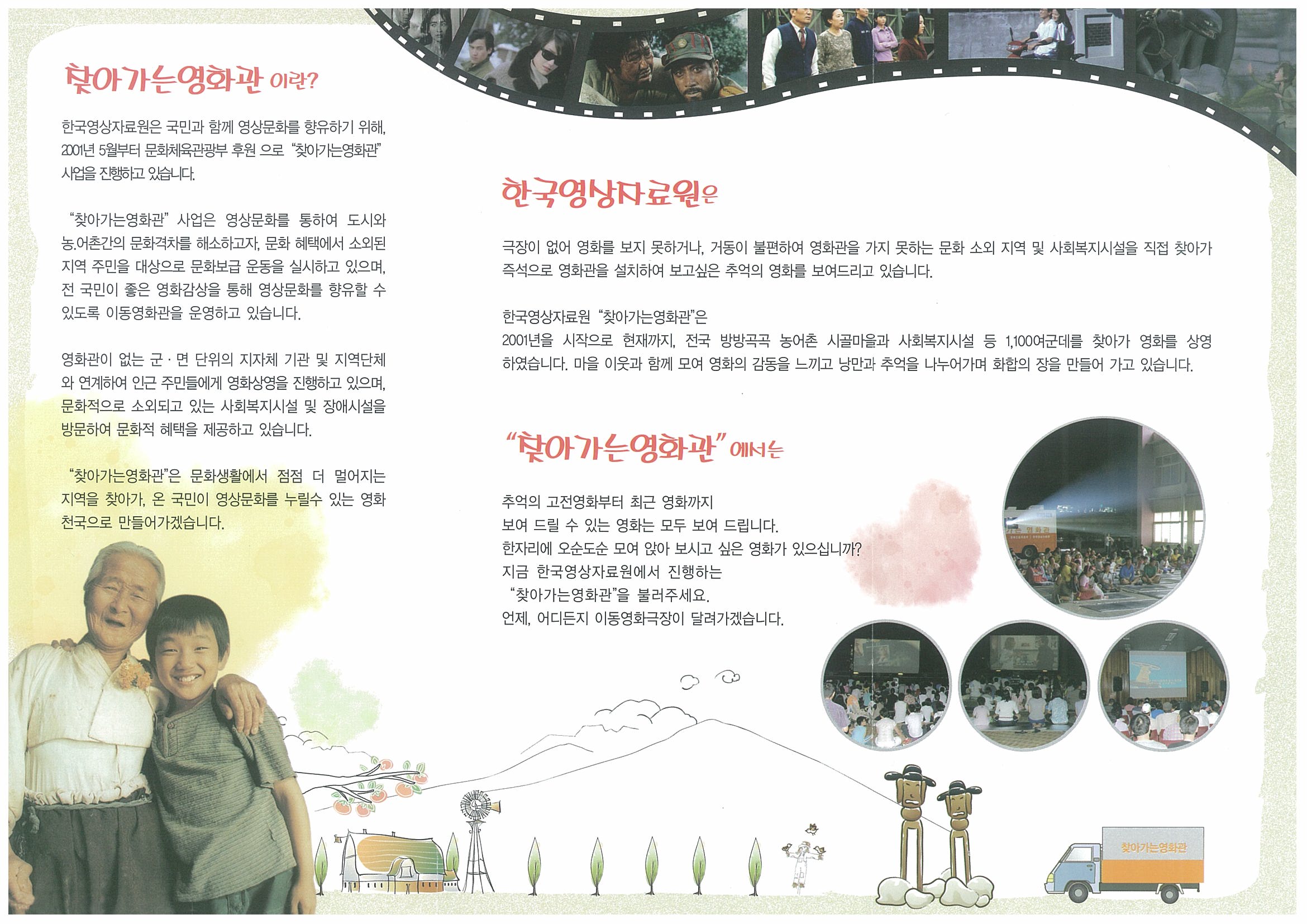 1. 문화체육관광부 산하기관인 한국영상자료원에서는, 극장시설 부재 등으로 영화 관람이 어려운 지역과 계층을 대상으로 영화관람 기회를 제공하고자, 전국을 대상으로 무료로 영화를 상영하는 「찾아가는 영화관」사업을 진행하고 있습니다.