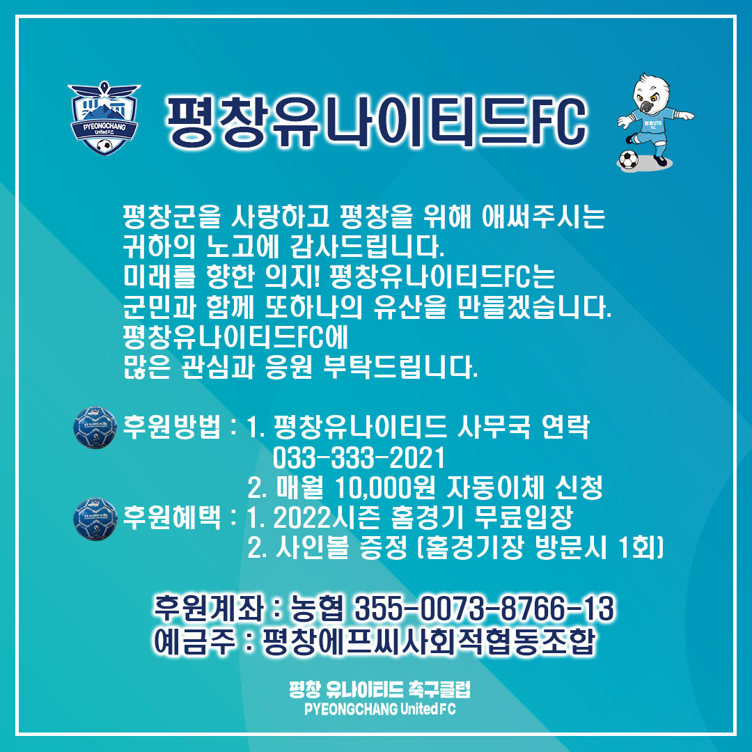후원계좌 : 농협 355-0073-8766-13 / 평창에프씨사회적협동조합