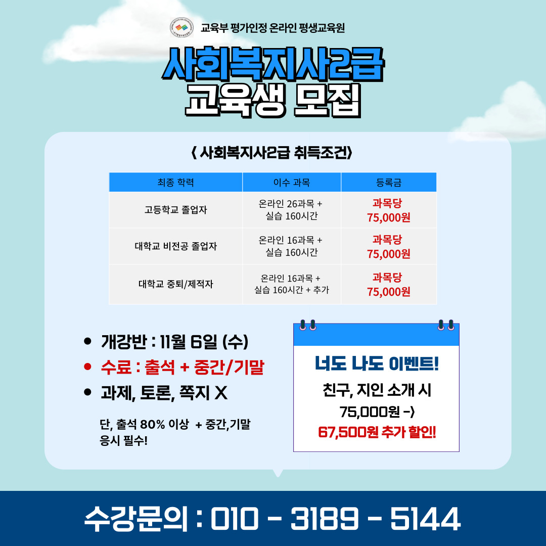[공고] 사회복지2급, 무시험과정 1년 교육생 모집