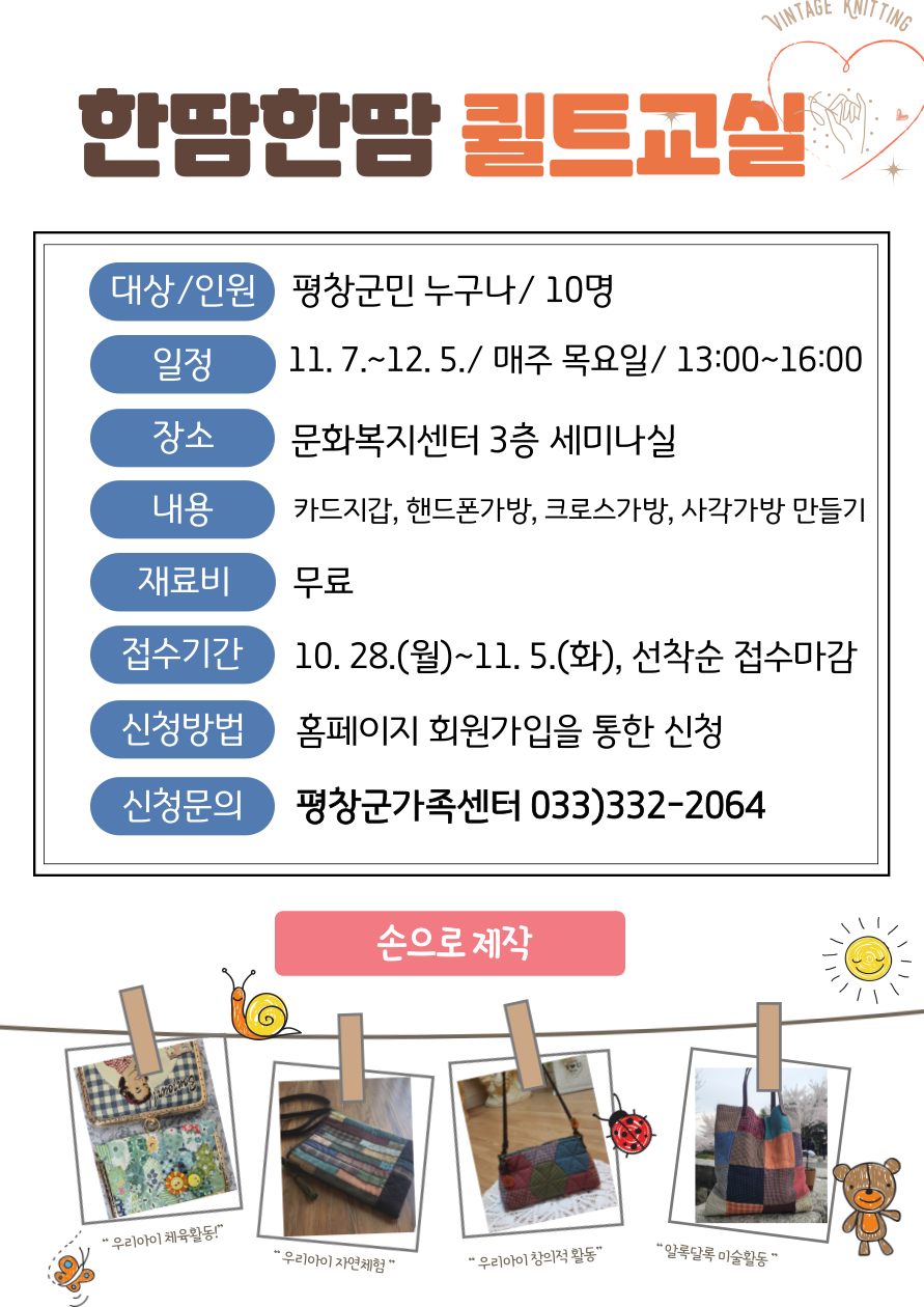 접수방법: 홈페이지 가입후 프로그램 신청(https://pyeongchang.familynet.or.kr/center/index.do)