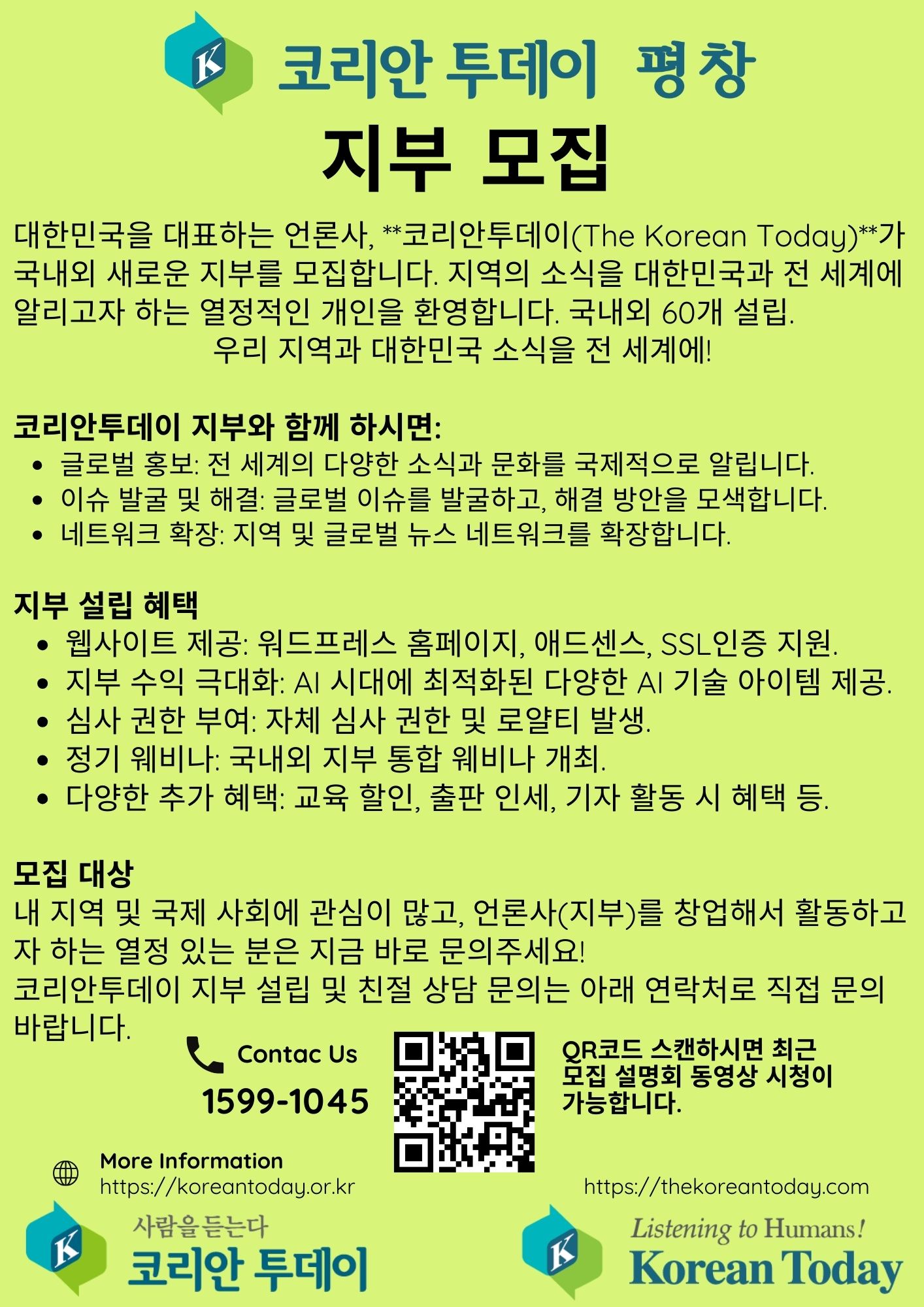 대한민국을 대표하는 언론사, **코리안투데이(The Korean Today)**가 국내외 새로운 지부를 모집합니다. 지역의 소식을 대한민국과 전 세계에 알리고자 하는 열정적인 개인을 환영합니다. 국내외 56개 설립.