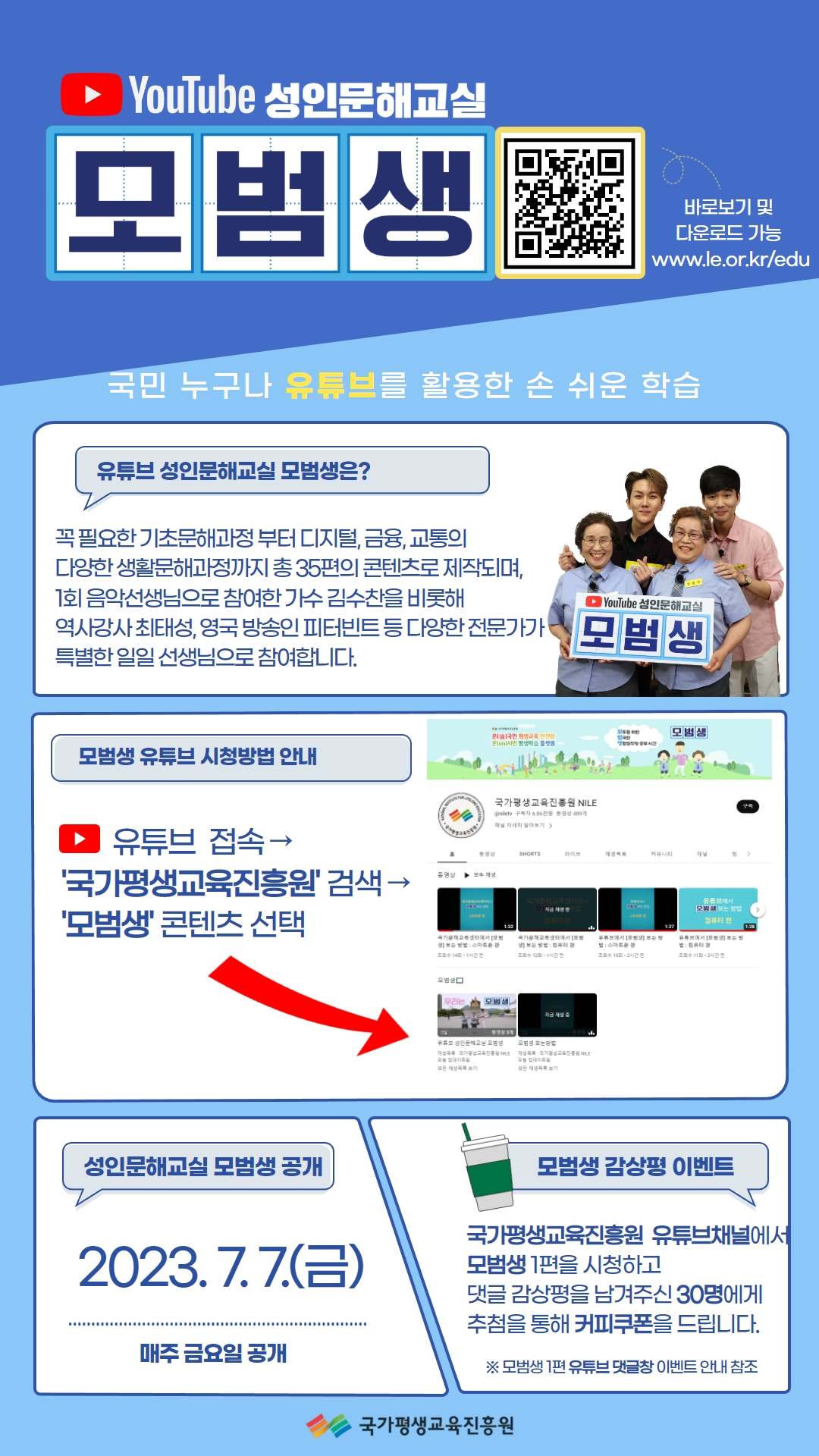 가. 프로그램: 유튜브 성인문해교실 '모범생' 나. 공개일시: 2023. 7. 7.(금) 09:00 ※ 매주 금요일 신규 콘텐츠 공개 예정 다. 채널주소 - 국가평생교육진흥원 유튜브 채널(https://www.youtube.com/@niletv) - 성인문해교육 e-학습터(https://www.le.or.kr/edu) |