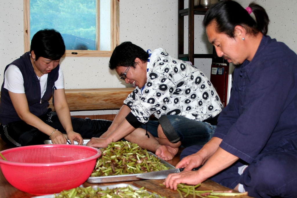 참가자들이 머위효소를 만들기 위해 직접 다듬고 손질을 하고 있다.