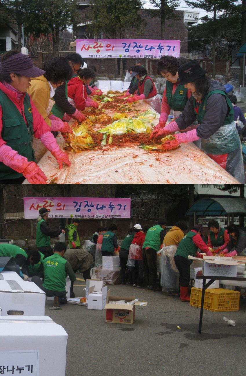 2011년 11월 7일 부터 8일까지 사랑의 김장나누기 행사가 진부면사무소 광장에서 새마을지도자 진부면 남녀 협의회(지도자회장 심현정, 부녀회회장 원영숙) 주관으로 김장 1500 포기를 담아 관내 독거노인을 비롯한 어려운 이웃과 함께 나누었습니다.