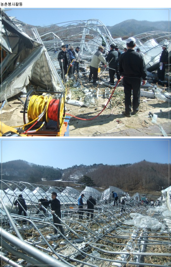 3월 14~15일 도 농업기술원 직원 40여명이 진부면 호명리 하우스 피해 농가를 방문하여 봉사활동을 펼쳤다.