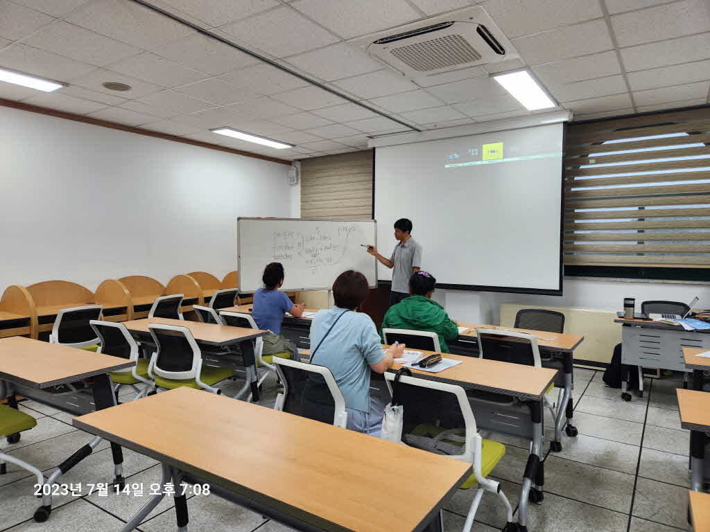 [2023년 주민생활외국어교실] 대화면 영어반 - 강 좌 명: 대화면 영어반 - 강 사 명: 차신덕 - 운영장소: 대화도서관 2층 - 운영일시: 수,금 19:00~21:00