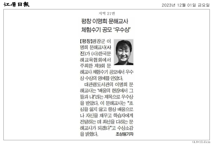 [2023. 12. 1.(금) 강원일보-지면] 평창 이명희 문해교사 체험수기 공모 '우수상'