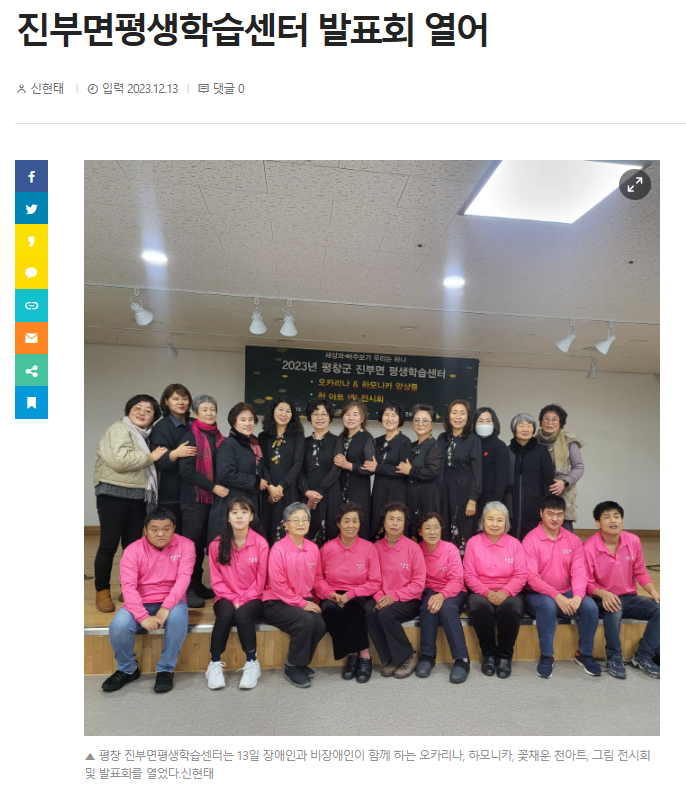 평창 진부면평생학습센터는 13일 장애인과 비장애인이 함께 하는 오카리나, 하모니카, 꽃채운 천아트 그림 전시회 및 발표회를 열었다