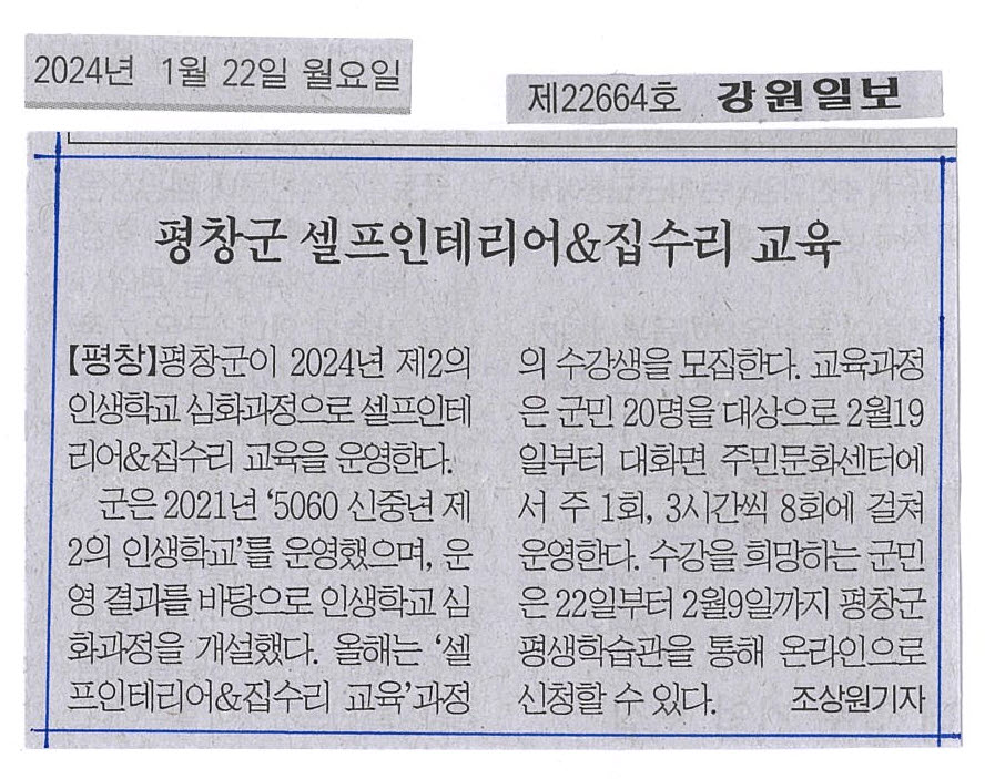 [2024. 1. 22.(월) 강원일보_지면] 평창군 셀프인테리어&집수리 교육