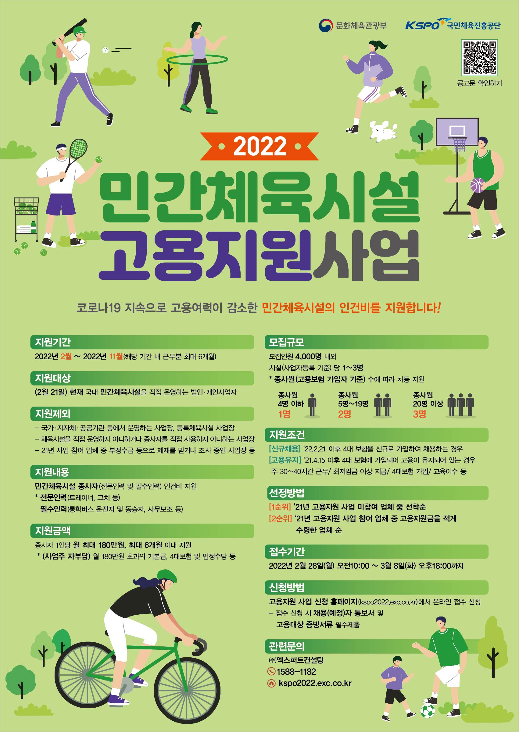 문화체육관광부와 국민체육진흥공단은 코로나19 지속으로 고용여력이 감소한 민간체육시설업체의 경영위기를 극복하고 안정적인 일자리 창출을 위해 지원 대상을 확대한 사업을 아래와 같이 민간체육시설 고용지원 사업을 시행하오니 민간체육시설업체의 적극적인 관심과 많은 참여 바랍니다.