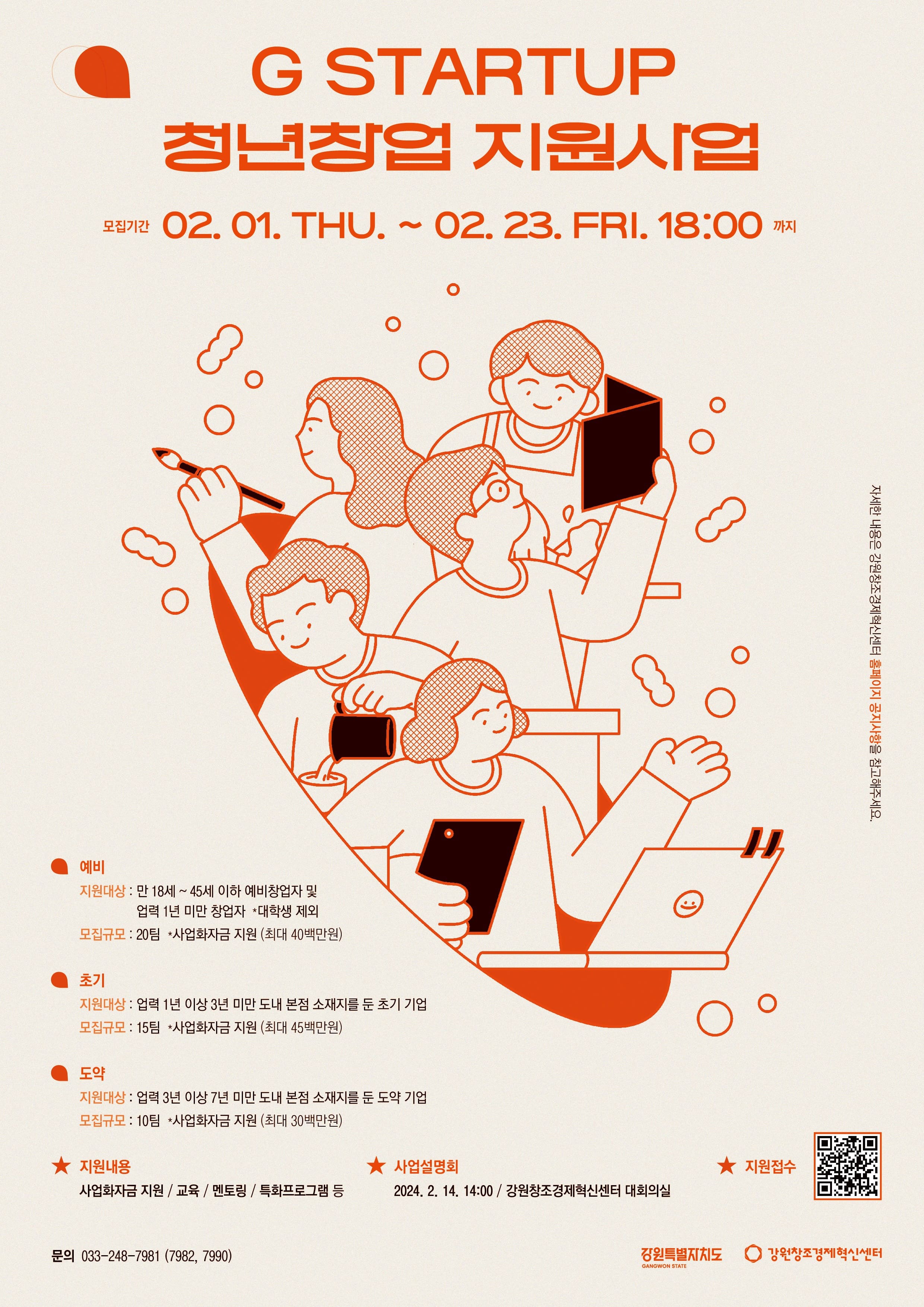 강원창조경제혁신센터에서는 강원특별자치도와 함께 혁신적인 기술 창업 소재가 있는 창업기업을 육성하기 위한 「G-스타트업 예비창업/초기창업/창업도약 지원사업」을 운영하고 있습니다. 이와 관련하여 도내에 유망한 (예비)창업자분들의 많은 참여 부탁드립니다.