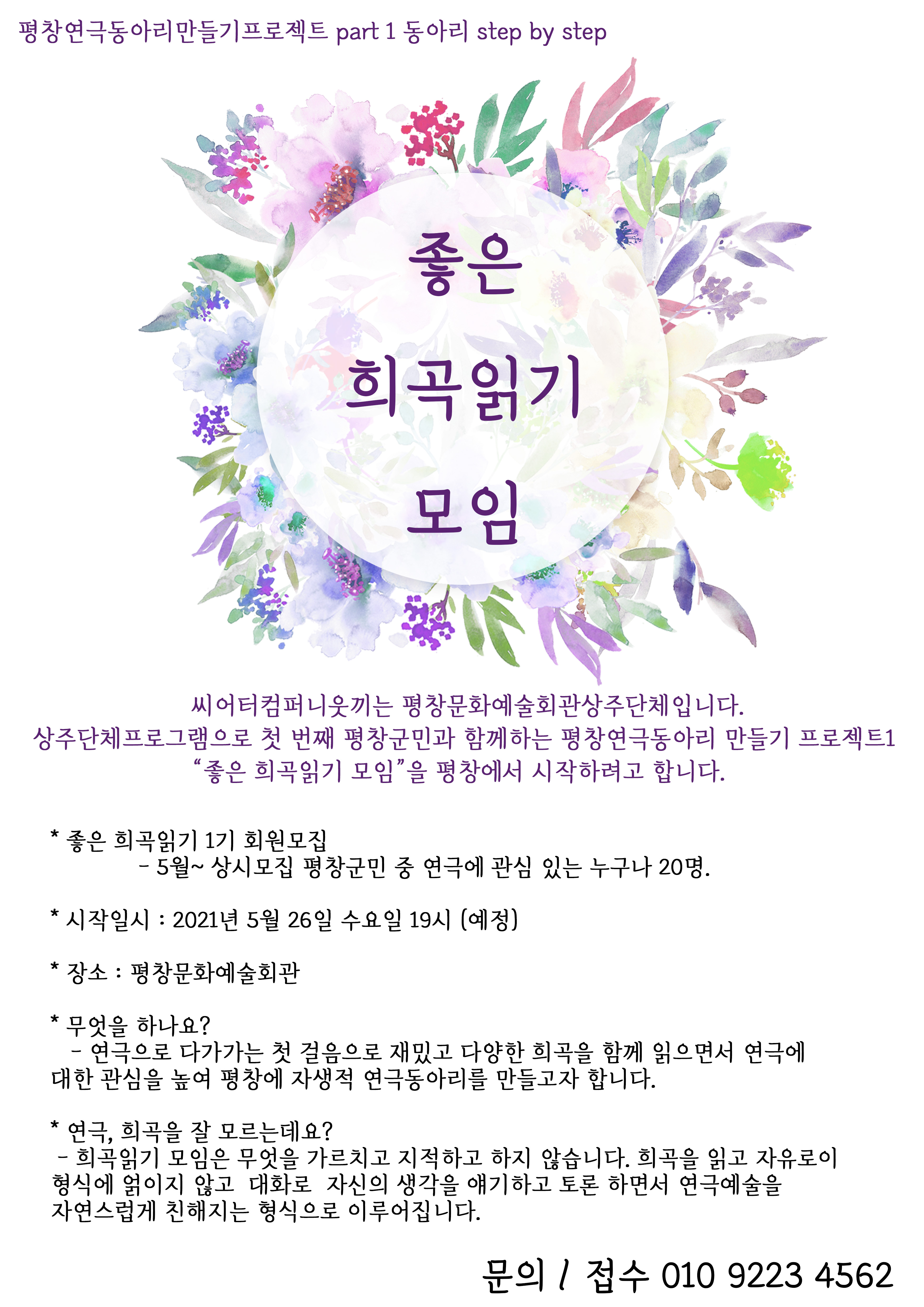 상주단체프로그램으로 첫 번째 평창연극동아리 만들기 프로젝트1 “좋은 희곡읽기 모임”을 평창에서 시작하려고 합니다.