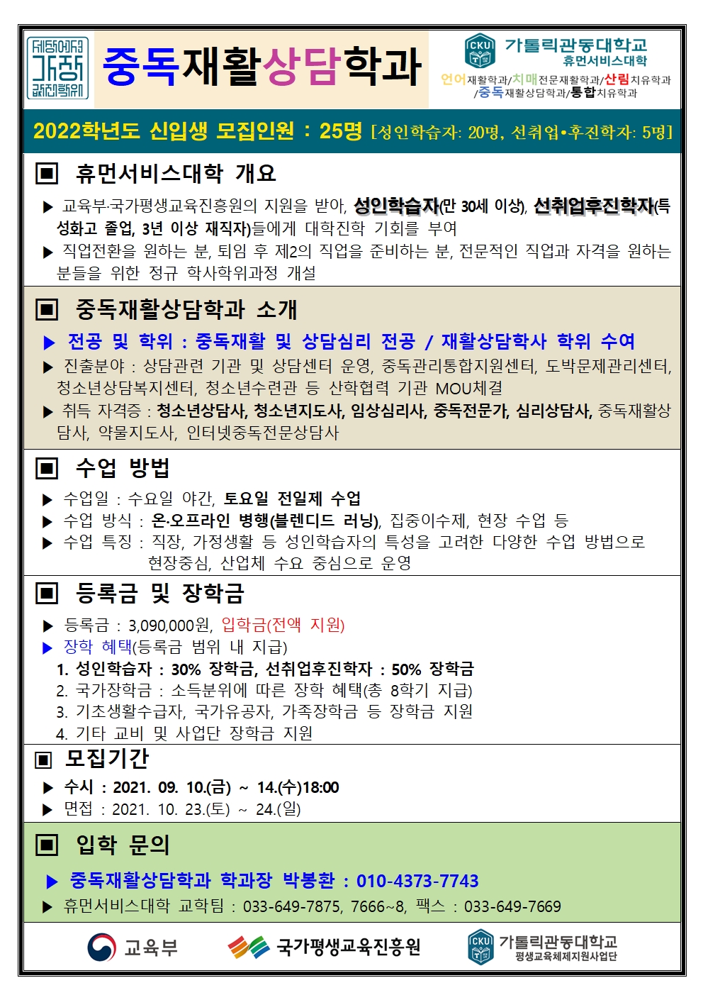 ▶ 휴먼서비스대학 교학팀 : 033-649-7875, 7666~8, 팩스 : 033-649-7669
