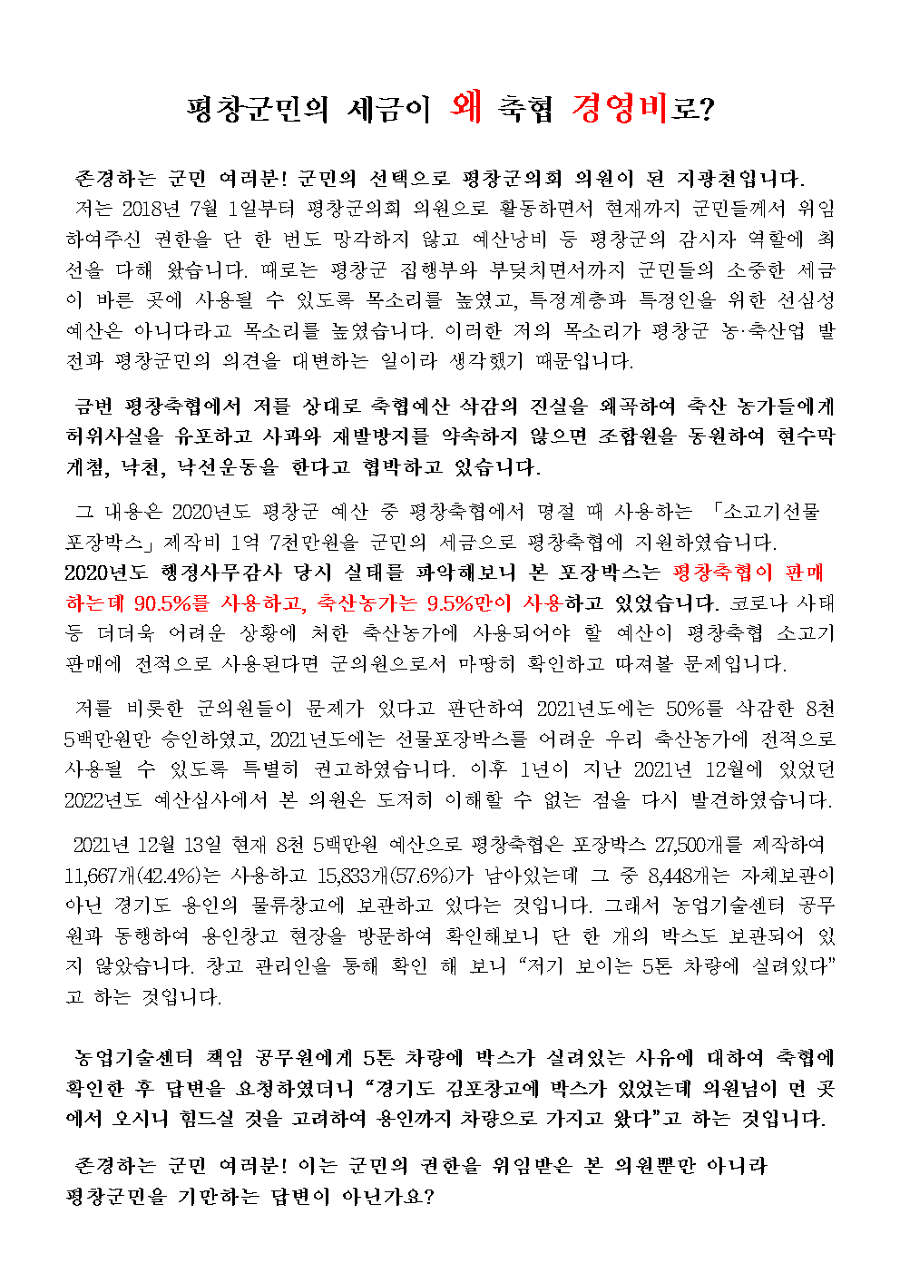 군민 여러분께 최근 평창축협의 예산삭감 현수막 게첨과 관련