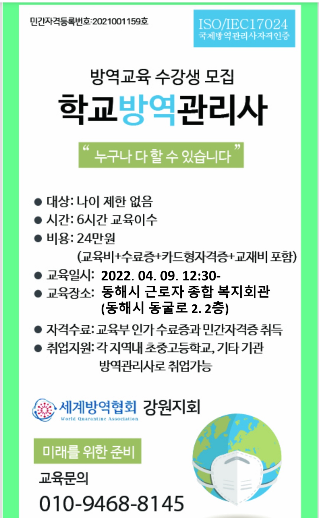 학교방역관리사 민간등록자격증 먼저 취득하여 좋은 일자리 우선 채용 선점^^