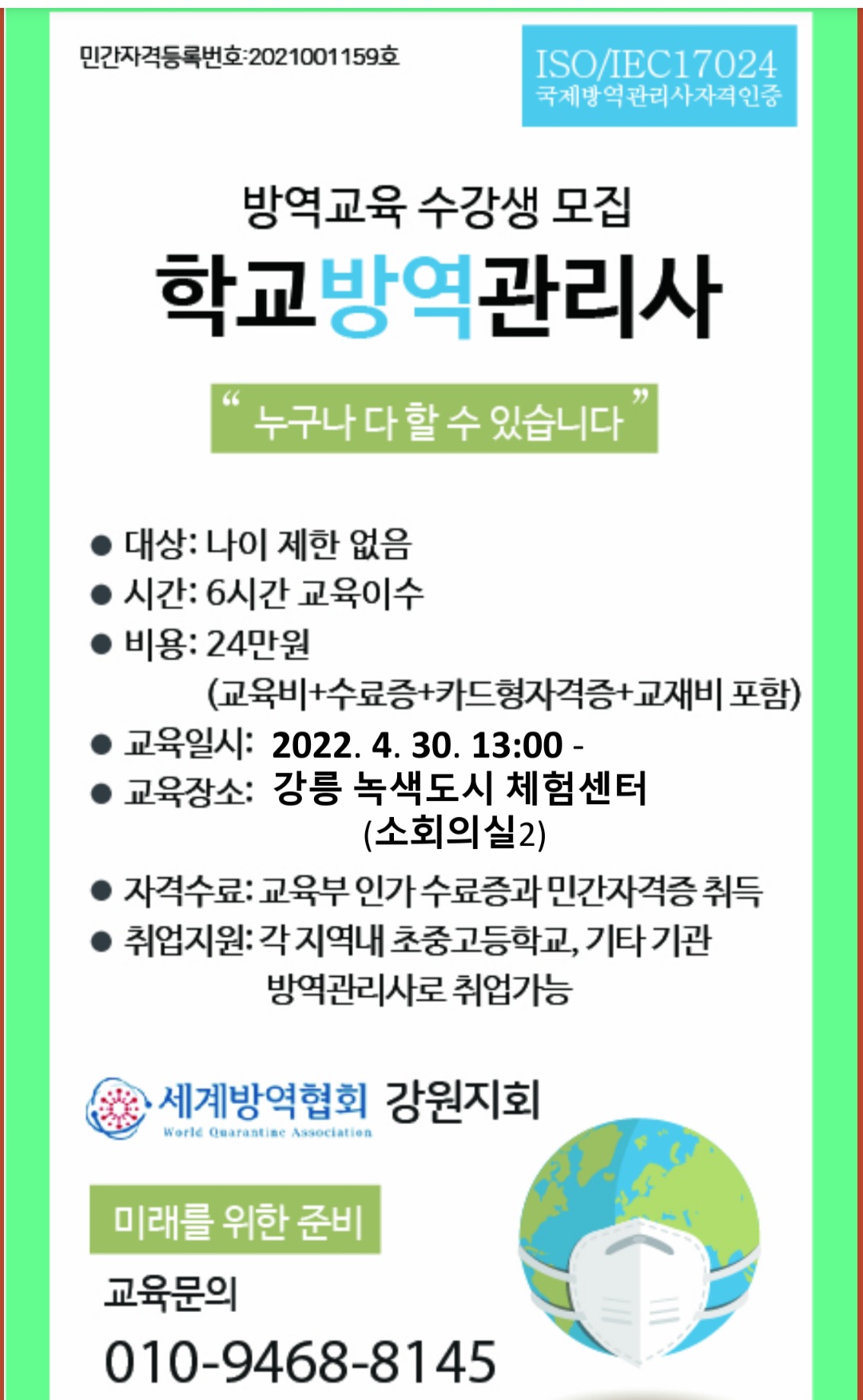 학교방역관리사 민간등록자격증 먼저 취득하여 좋은 일자리 우선 채용 선점^^