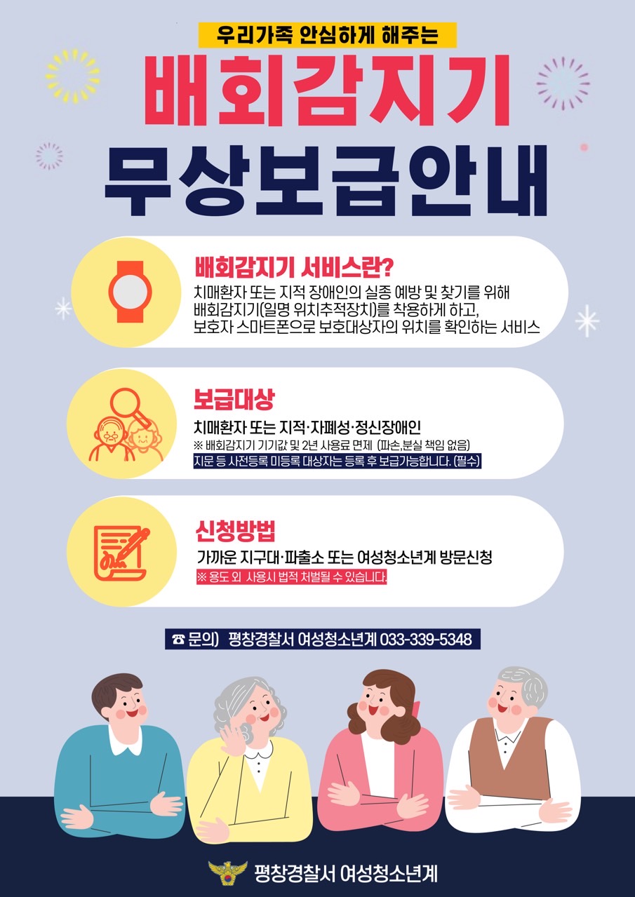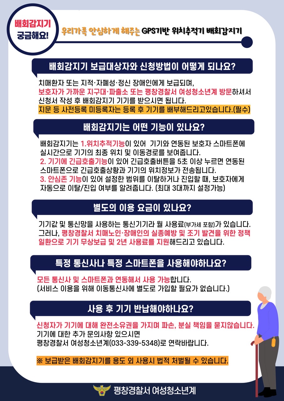 2022년 평창경찰서에서 치매환자, 지적 장애인 등 사회적 약자의 실종예방 및 신속한 발견을 위해 손목시계형 배회감지기(일명 위치추적장치) 확대보급 사업을 추진하고 있습니다.