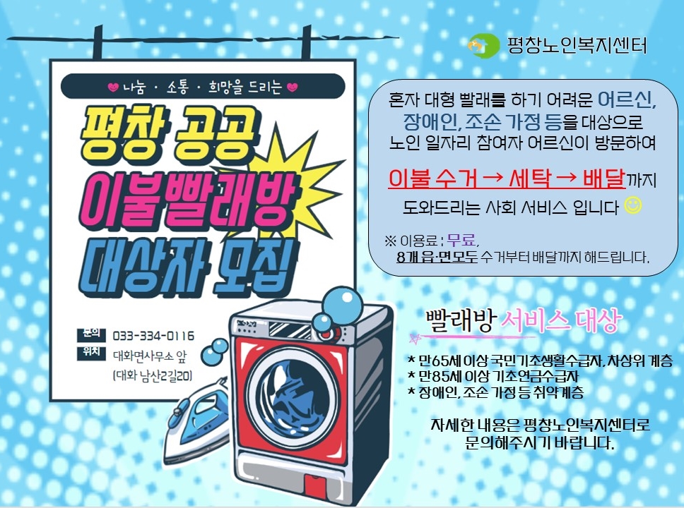 평창노인복지센터에서는 평창 공공 이불 빨래방 대상자를 모집하고 있습니다.