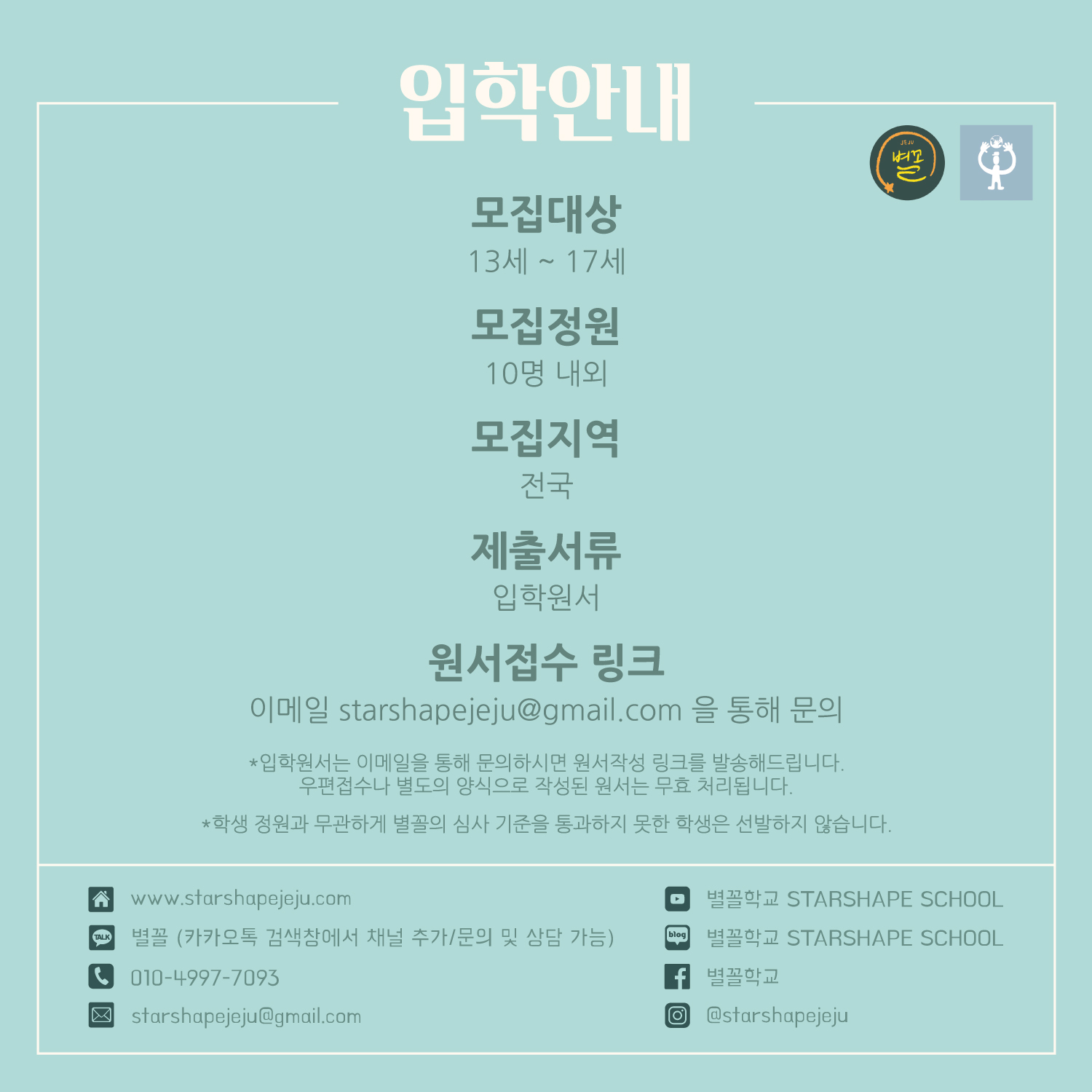 별꼴학교는 아름다운 제주 성산 바닷가에 자리잡고 있는 1년제 자유학교입니다. 1년간 다양한 프로젝트 중심의 학습을 통해 자유롭게 배우고 싶은 청소년은 누구나 환영합니다. Different is beautiful!