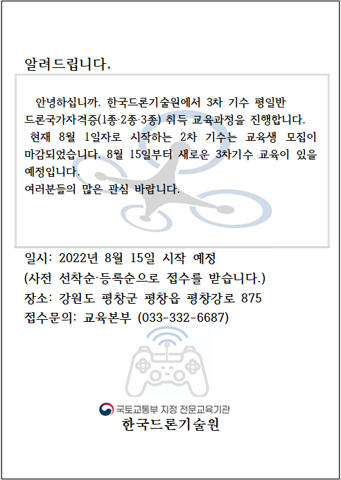한국드론기술원에서 제2비행라인의 신규 개설이 예정됨에 따라 3차 기수 평일반 교육생을 모집합니다. 많은 관심 부탁드립니다.