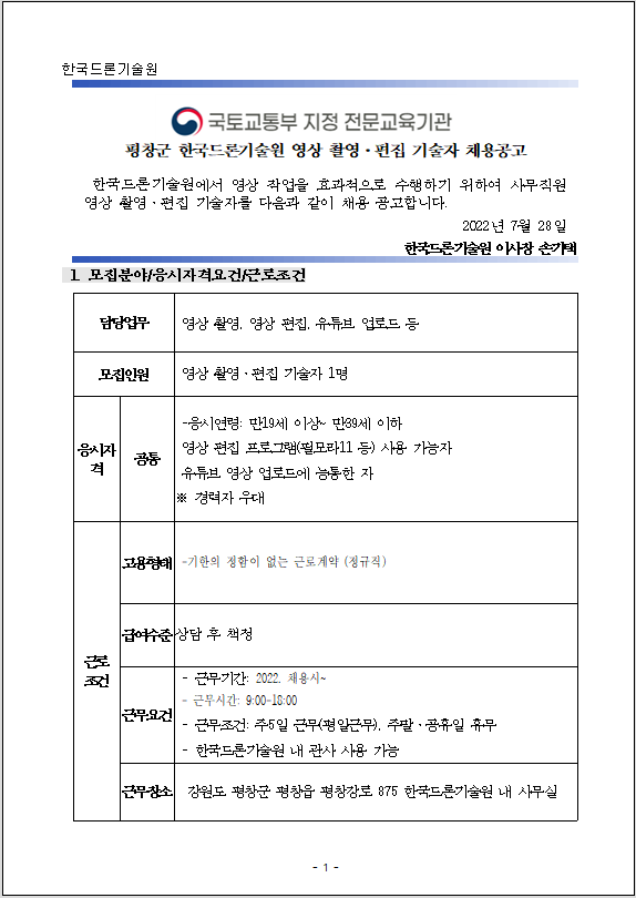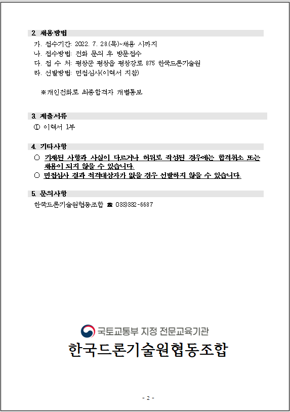 근 무 처 : 한국드론기술원협동조합(평창군 평창읍 평창강로 875)