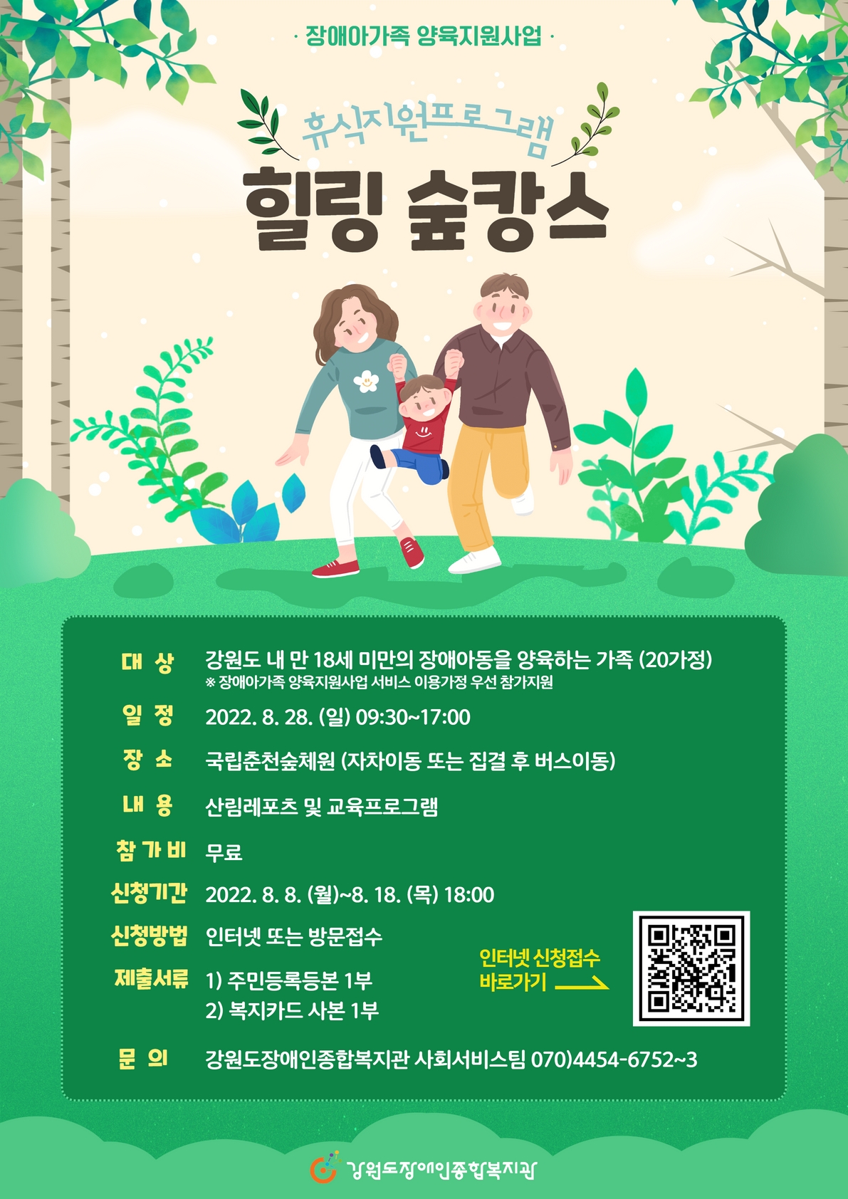 강원도장애인종합복지관에서는 가족문화프로그램 "힐링 숲캉스"(장애아가족양육지원사업) 참가자를 모집하오니, 관심 있으신 가정에서는 신청 바랍니다.