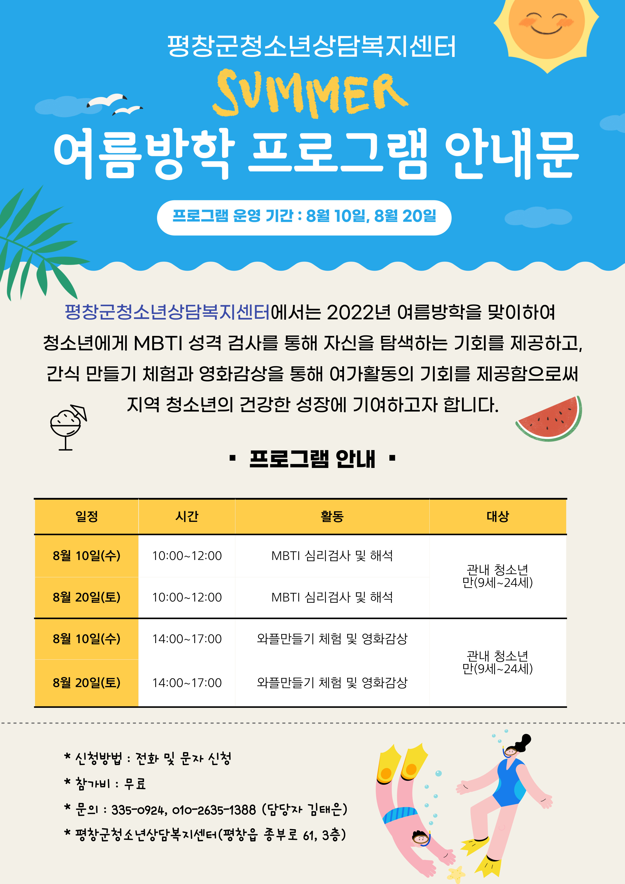 평창군청소년상담복지센터 8월 20일 프로그램 안내