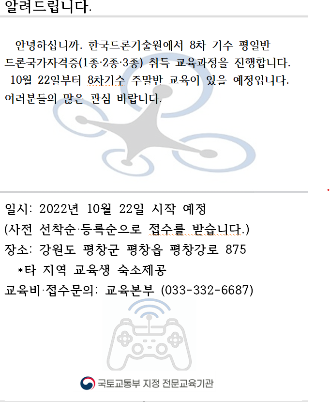 한국드론기술원 교육본부 033-332-6687로 연락.