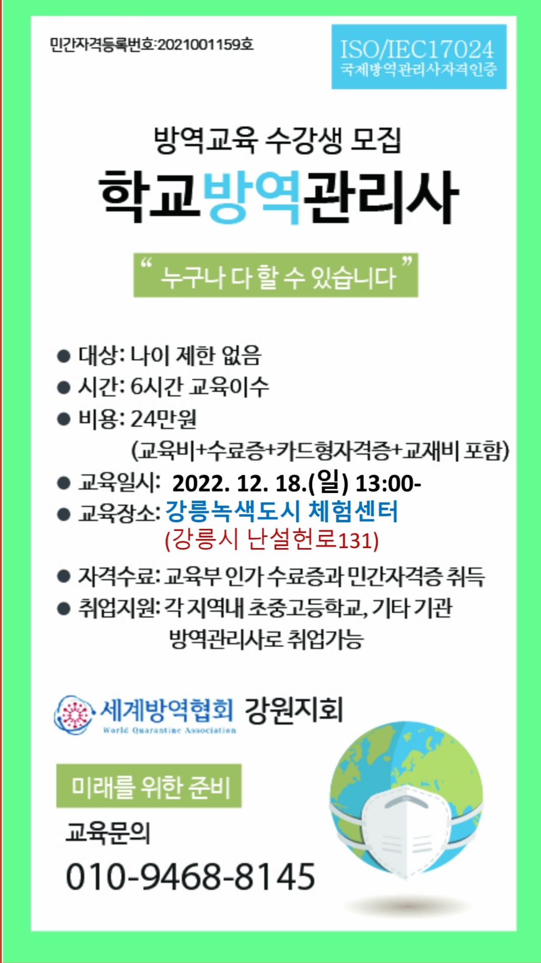 ●학교방역 관리사 자격취득을 위한 강원 지역 12월 교육 안내 ●