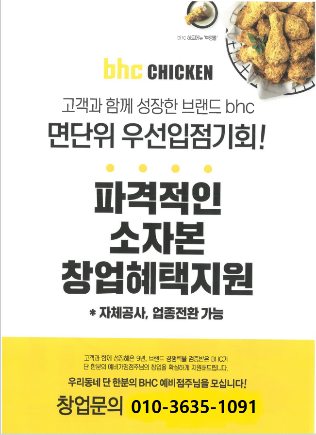 현재 BHC치킨에서 면 단위 신규 창업, 업종전환 창업 시 파격적인 지원 혜택을 드리고 있습니다.