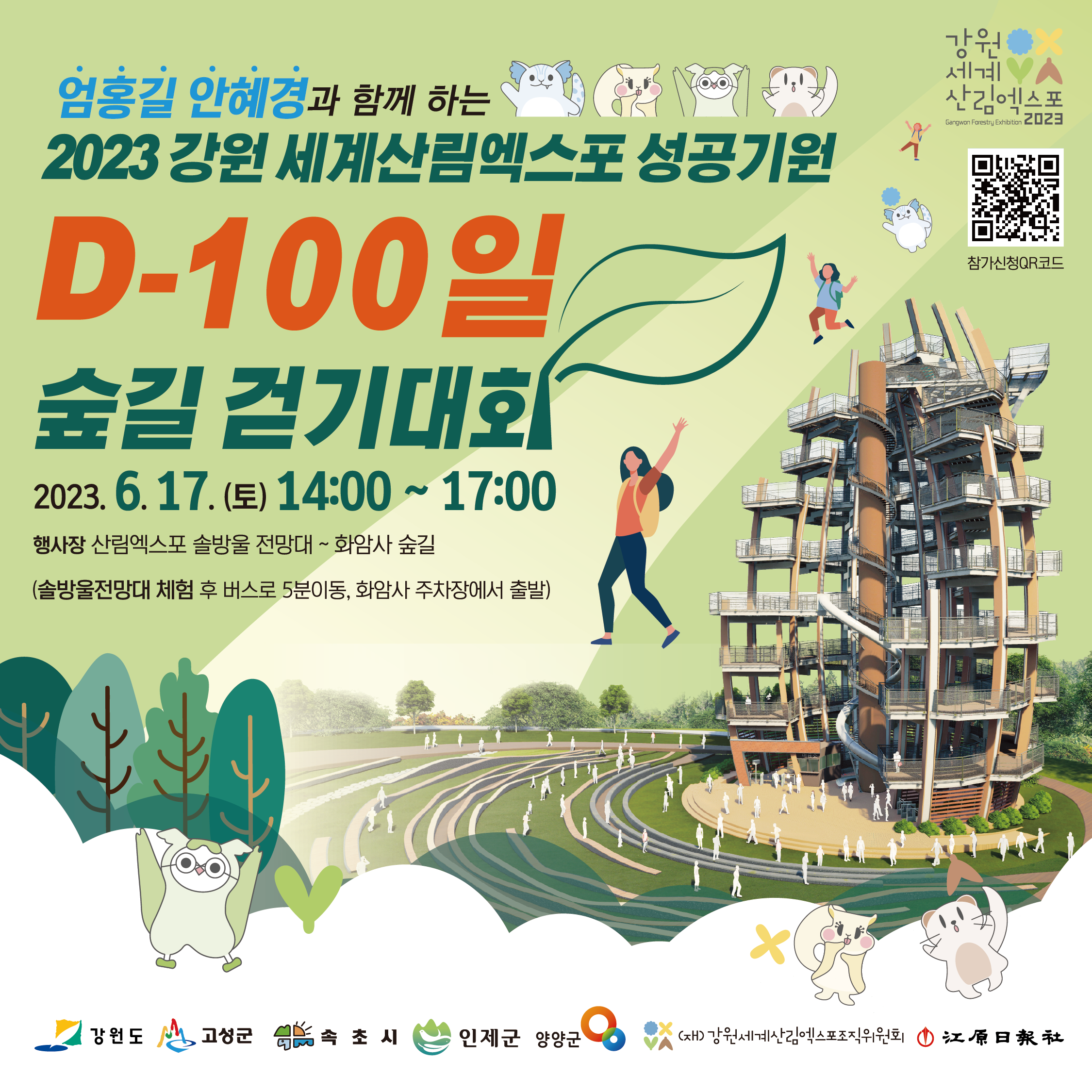 창간 78주년을 맞은 강원일보사와 강원도, 고성군, 속초시, 인제군, 양양군 (재)강원세계산림엑스포조직위원회가 공동 주최하는 강원특별자치도 성공출범 기념 및 2023강원세계산림엑스포 붐 조성을 위한 D-100일 숲길 걷기대회에 도민들의 많은 관심과 참여를 바랍니다.