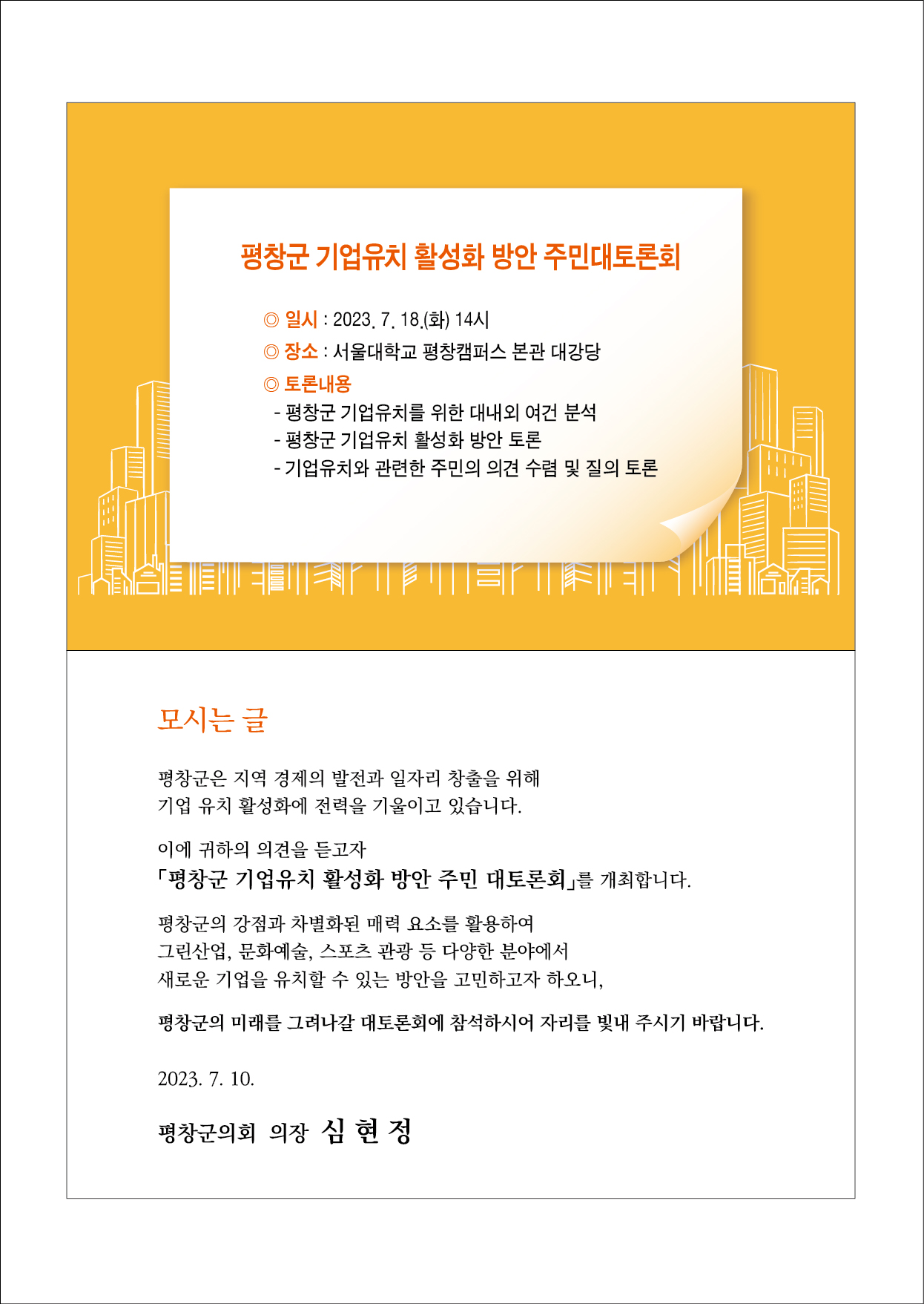 "평창군기업유치 활성화 방안 주민대토론회"를 개최합니다.