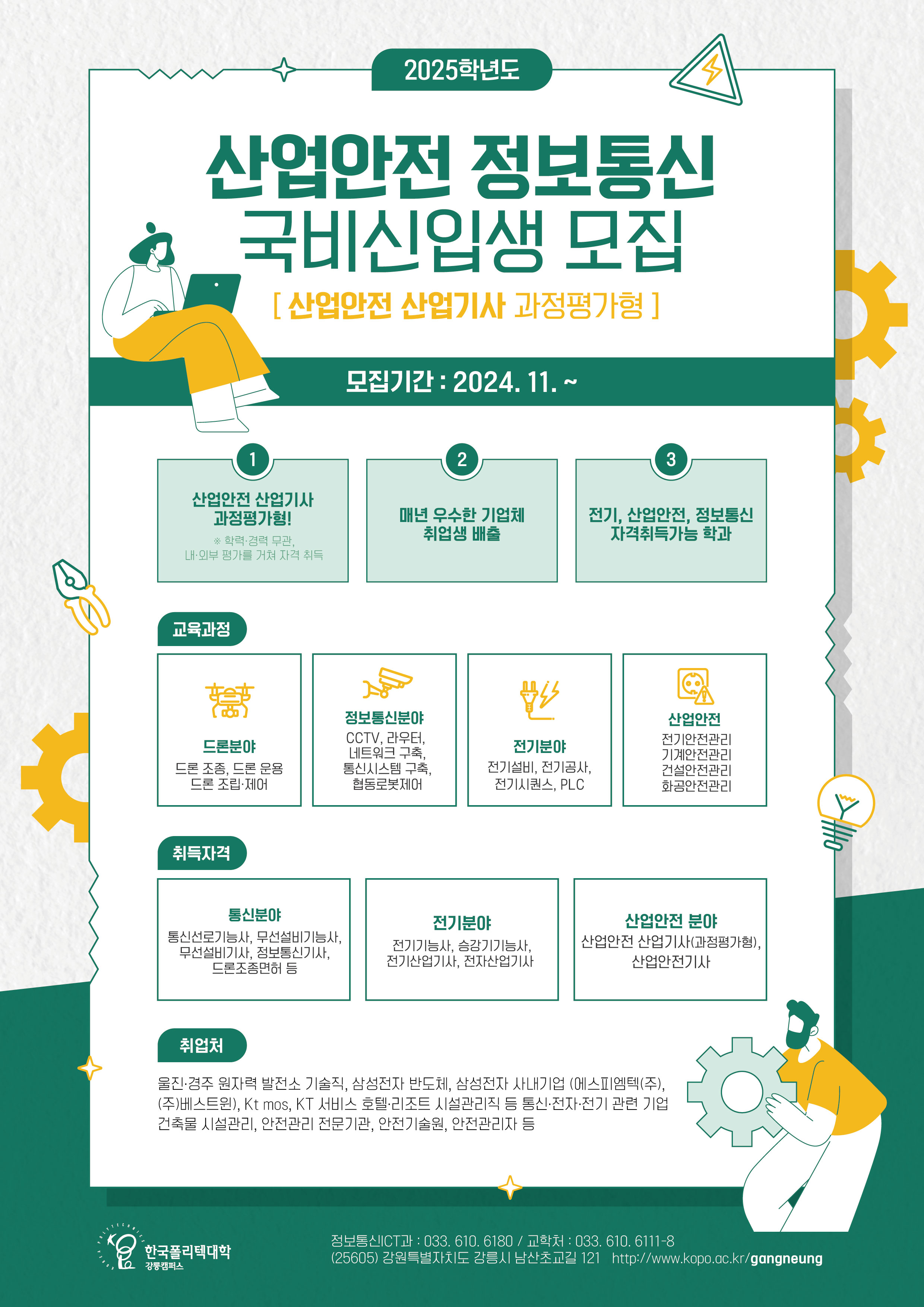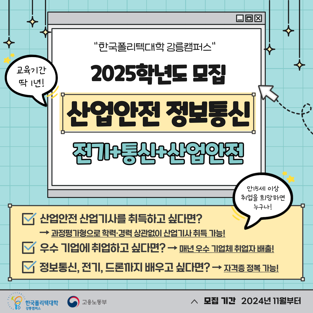 2025학년도 정보통신+전기+산업안전기사 자격취득 1년과정 모집 합니다.(강릉폴리텍대학) 무료, 수당, 숙식제공