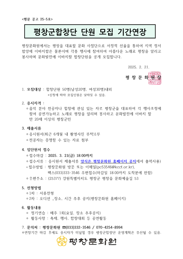 평창군합창단원 모집 기간 연장