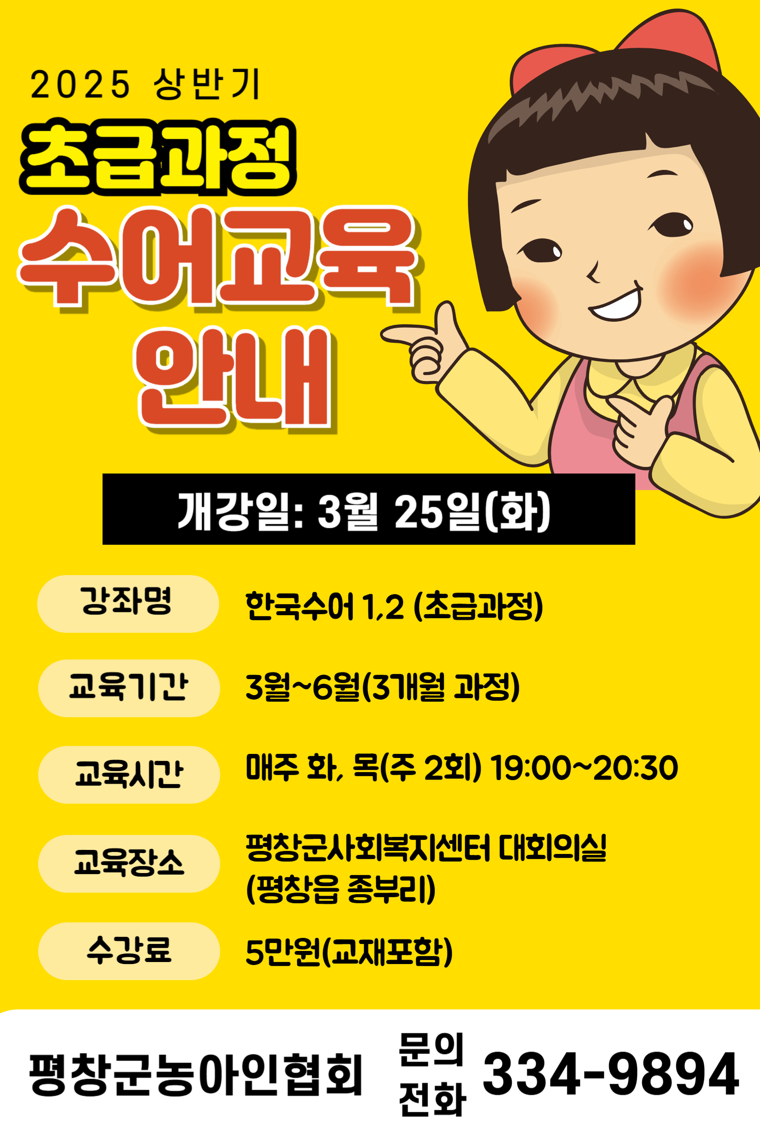 평창군수어통역센터 '한국수어 초급반' 과정 개설 안내