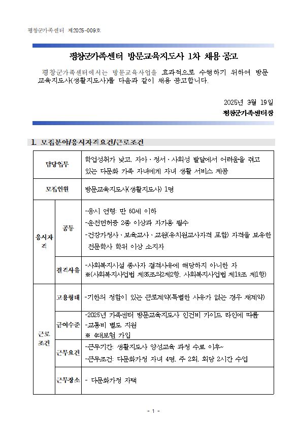 평창군가족센터 방문교육지도사 1차 채용 공고
