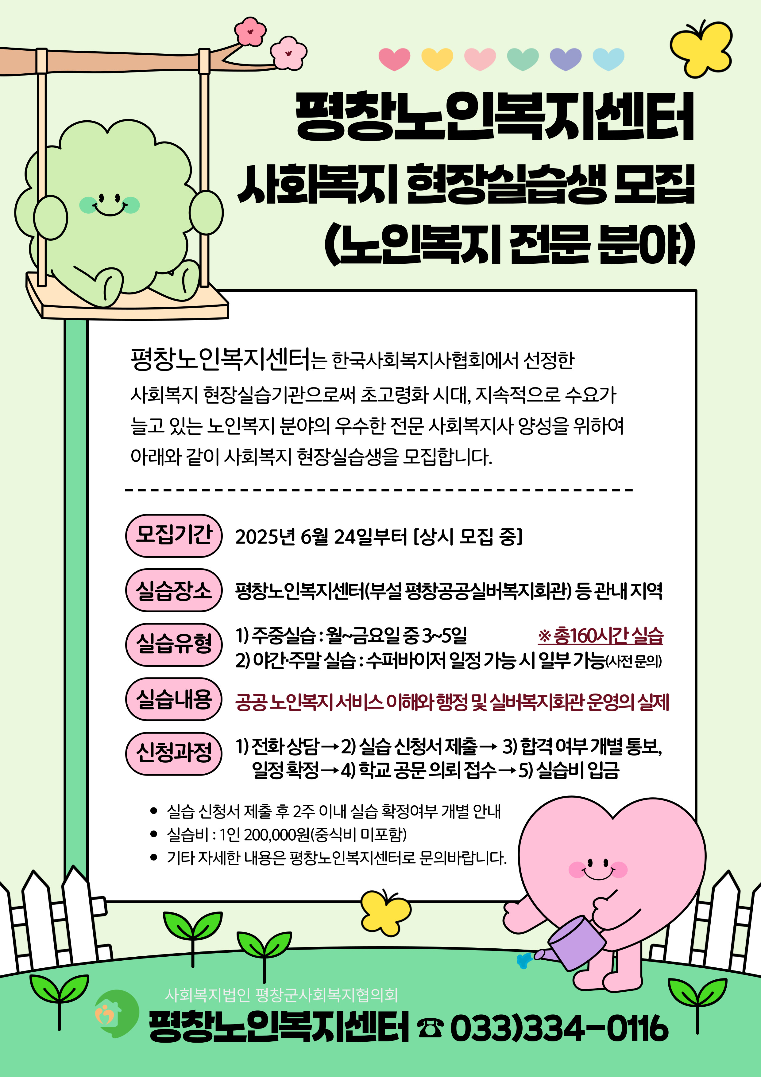 사회복지 현장실습을 희망하는 분께서는 평창노인복지센터로 문의 바랍니다. ☎ 033-334-0116