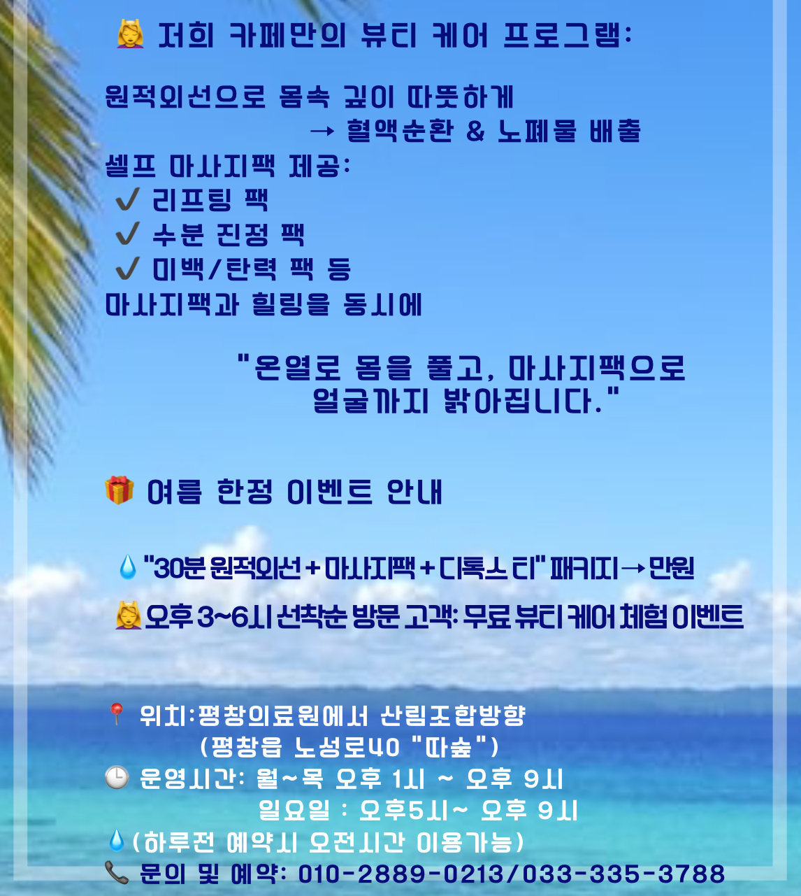 여름엔 저온원적외선테리피로 건강과 미용까지 따숲에서 누리세요~~