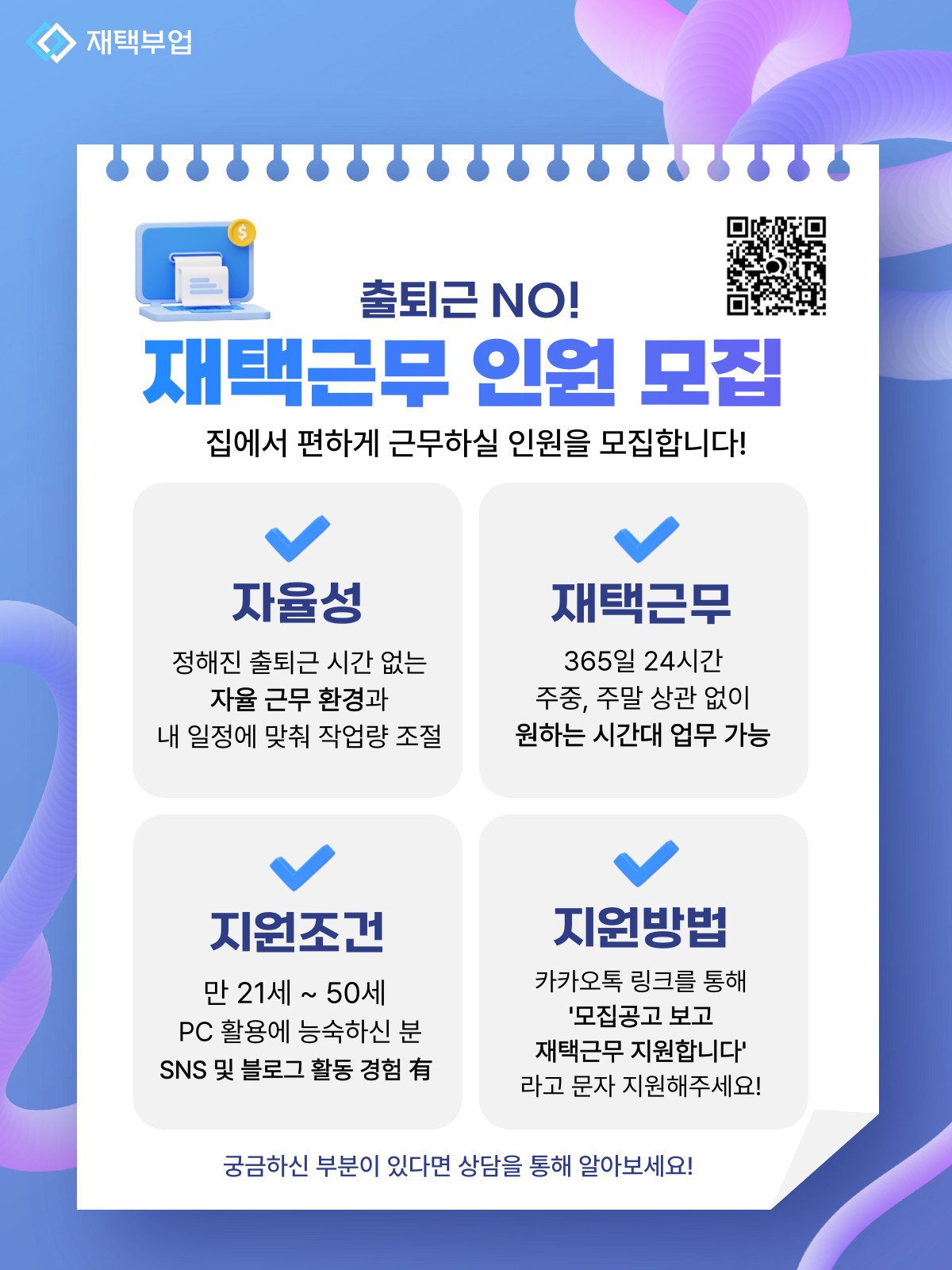 현재 집에서 편안하게 업무를 진행하실 수 있는 재택근무 인원을 모집하고 있습니다.