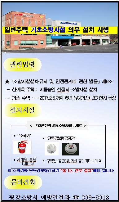 소방시설설치유지법 제8조 개정에 따라 일반 주택에 기초소방시설을 2012.2.5일 부터 의무적으로 설치해야 합니다.