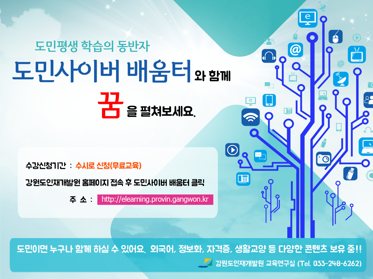 도인재개발원에서는 도민들을 대상으로 다양하고 질 좋은 교육서비스를 제공하기 위하여 금년 3월부터 <도민사이버 배움터>를 새롭게 개선 운영하고 있습니다. 주민 여러분의 많은 관심과 참여 부탁드립니다.