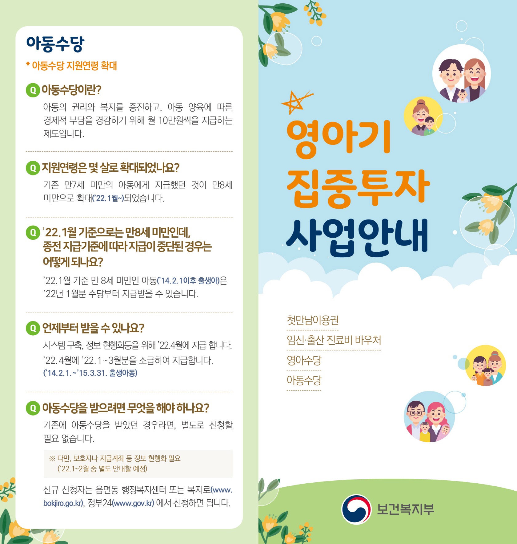 「아동수당법」개정(만7세 미만 →만8세 미만 아동으로 연령 확대, '22년 4월 1일 시행)에 따라 아동수당 연령확대 안내드리니 첨부물을 확인하시기 바랍니다.