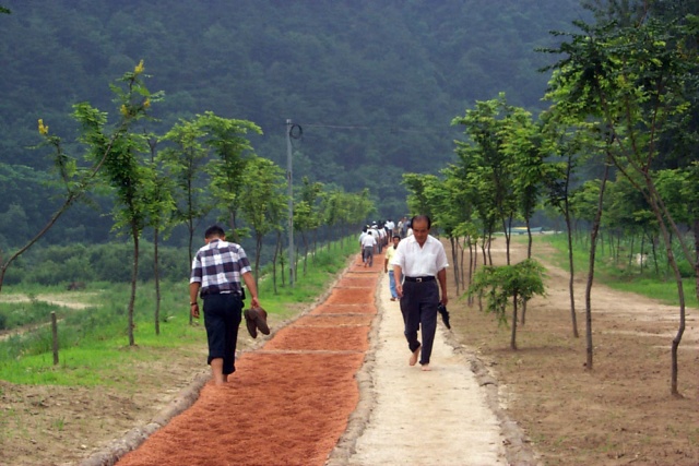 이름도 이색적인 이 곳은 원래 '노람뜰'이라는 곳으로 평창강이 바로 접하면서 휘감고 있고 앞산인 장암산에서는 패러글라이딩 활공장이 있어 착륙장으로 활용되는 곳으로 여름에는 넓은 공터를 활용해 오토캠핑으로도 각광을 받는다. 그 중 입구 250m는 황토볼이 깔린 산책로가 있는데 이 곳이 맨발공원이다. 1.5mm, 8mm, 12mm, 18mm의 황토볼이 총 40톤 정도가 소요된 이 황토길 250m를 걸으면 25km를 등산한 효과가 있다고 한다. 고대의서는 물론 최근 황토에서 나오는 원적외선이 우리 몸에 유익하다는 근거로 주목받고 있는 황토볼 산책로는 평창주민은 물론 외지 관광객에게도 각광받는 이색쉼터로 인기를 모으고 있다. 우리 발은 많은 경혈이 집결되어 있어 그 자극으로 인체의 건강을 체크할 수 있다고 하는데 어린이 일수록 건강해서 쉽게 걸어갈 수 있지만 어른일수록 걷기 힘들다고 한다. 맨발공원 주변에는 가족 휴양지로 제격인 오토캠프장이 위치하고 있어 잠시 들르기에 좋다. 별도의 입장료 없이 누구나 이용할 수 있으며 평창시내에서 상리교를 건너기 전 좌회전 후 약 1.5km지점에 위치하고 있다
