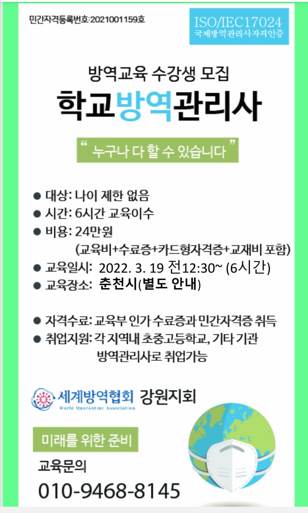 학교방역관리사 민간등록자격증 먼저 취득하여 좋은 일자리 우선 채용 선점^^